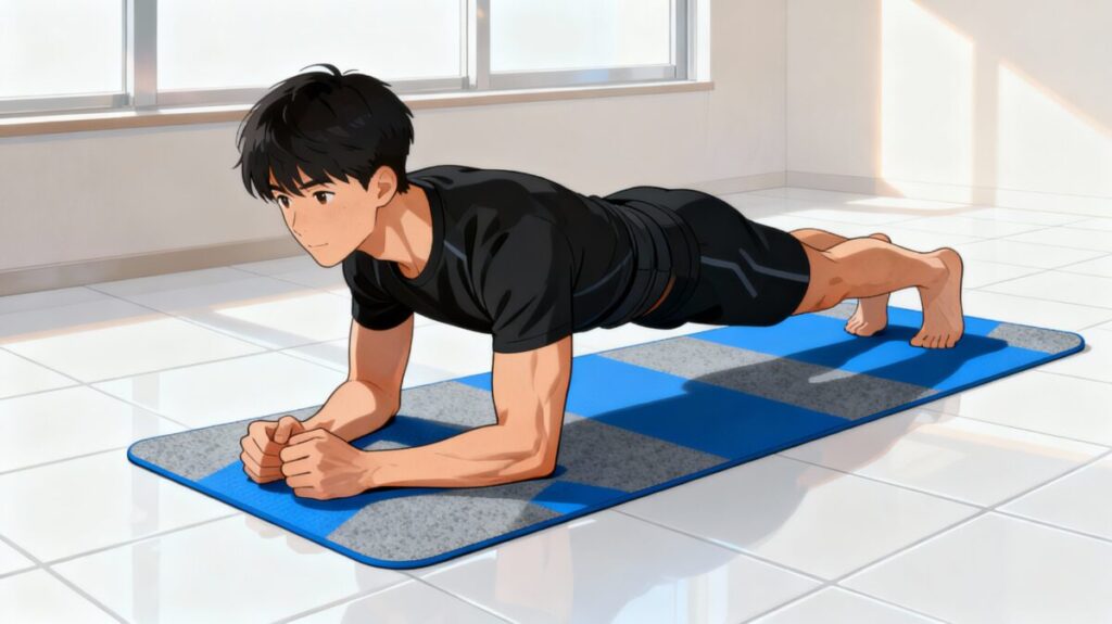 プランクは、うつ伏せの状態から肘と前腕、つま先で体を支える姿勢を保つトレーニングです。最初は10秒から始めて、徐々に時間を延ばしていきましょう。このとき、腰を反らせないように注意することが非常に重要です。