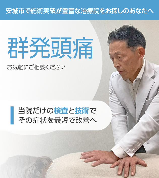 病院やほかの治療院で改善しなかったとしても諦める必要はありません。群発頭痛でお困りなら経験豊富な施術実績を誇る当院にお任せください。